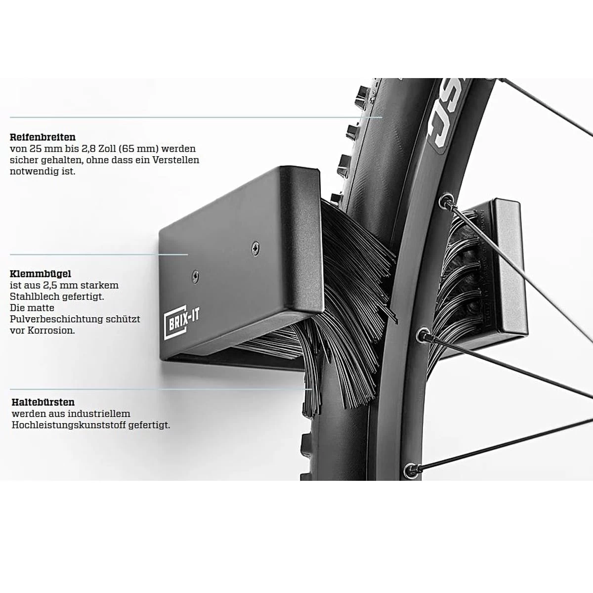 Das BRIX-IT ist eine revolutionäre Fahrrad-Wandhalterung. Von einem schwäbischen Familienvater per Zufall erfunden und bis ins kleinste Detail bis hin zum patentierten Produkt ausgetüftelt, ist das BRIX-IT die erste bürstenbasierte Halterung für Fahrräder. Die hochwertige Konstruktion hält gängige Fahrradtypen – auch E-Bikes – schonend und sicher und die Bedienung ist kinderleicht!