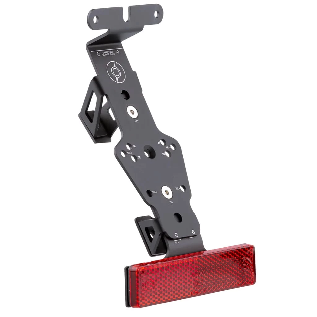 Der SUPERNOVA L1 UNIVERSAL LEGAL KIT Kennzeichenhalter für S-Pedelecs ist perfekt für die Montage am Schutzblech. Der aus eloxiertem matten Aluminium Halter lässt sich verstellen und ist passend für alle EU Kennzeichen. Der rote Reflektor mit E-Nummer ist Teil des Lieferumfangs. Der Kennzeichenhalter ist auch kompatibel mit dem M99 TAIL LIGHT 45 km/h (das Rücklicht ist nicht enthalten).